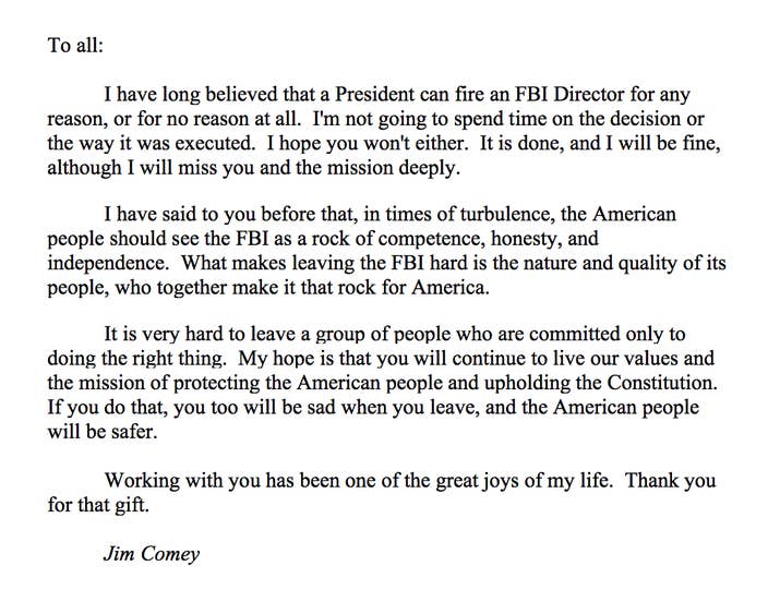 "I have since quite a while ago trusted that a President can fire a FBI Director for any reason, or for reasons unknown whatsoever," Comey composed. "I'm not going to invest energy in the choice or the way it was executed. I trust you won't either. It is done, and I will be fine."