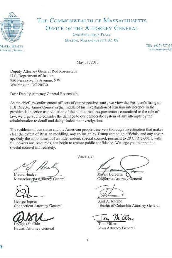 "As the central law implementation officers of our particular states, we see the President's terminating of FBI Director James Comey amidst his examination of Russian obstruction in the presidential race as an infringement of general society believe," the letter expressed. "As prosecutors focused on the administer of law, we encourage you to consider the harm to our law based arrangement of any endeavors by the organization to wreck and delegitimize the examination."